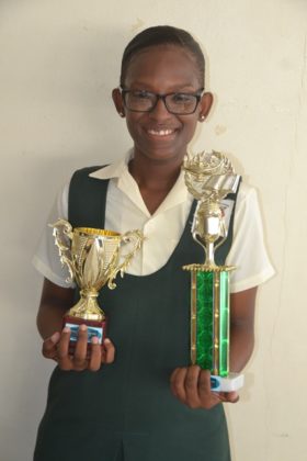 Capreace Walks of Zeeburg Secondary displaying her trophies for Best Speaker.