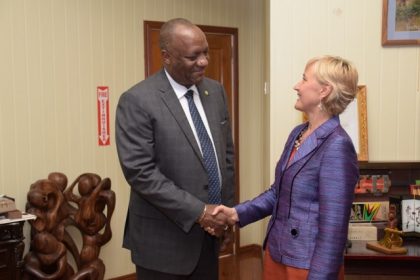 Minister of State, Mr. Joseph Harmon greets Ms. Marianne Mikko, member of the Delegation from Estonia, and Member of the Estonian President’s Advisory Committee on the United Nations Security Council (UNSC) Campaign for 2020-2021.