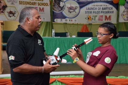Georgetown, Guyana (February 28, 2018) In an effort to equip teachers, students and residents of Bartica with the technological skills that can assist in providing modern solutions to the challenges of transitioning Bartica, Cuyuni-Mazaruni (Region Seven) to the first model ‘green’ town in Guyana and the Caribbean as envisioned by President David Granger, the Office of Climate Change (OCC), in collaboration with STEM Guyana and the Caribbean Community Climate Change Centre (CCCCC) or 5Cs, yesterday launched the STEM Bartica Programme at two secondary schools in the region. Funding for this project is provided by the Italian Government.