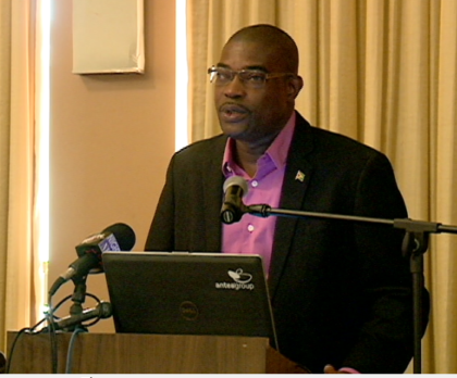 Minister of Public Infrastructure, David Patterson addressing the gathering at the stakeholder consultation for the feasibility study for the new Demerara River Bridge