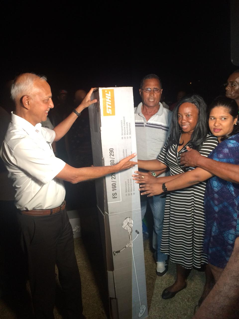 Bulkan 2April 16, 2019 Minister of Communities, Ronald Bulkan handing over a brush cutter to Deputy Head Mistress of Crabwood Creek Primary, Aileene Davidson and Teacher Waheeda Hussain.