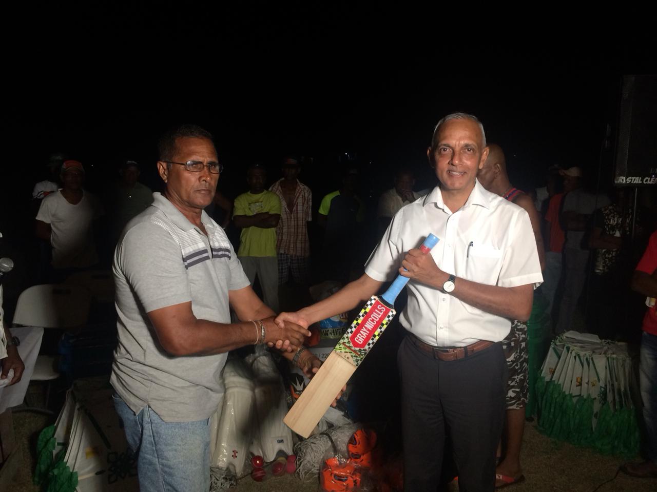 Bulkan 3April 16, 2019 Minister of Communities, Ronald Bulkan handing over the sport gear to President of the Crabwood Creek community ground, Dennis DeAndrade.