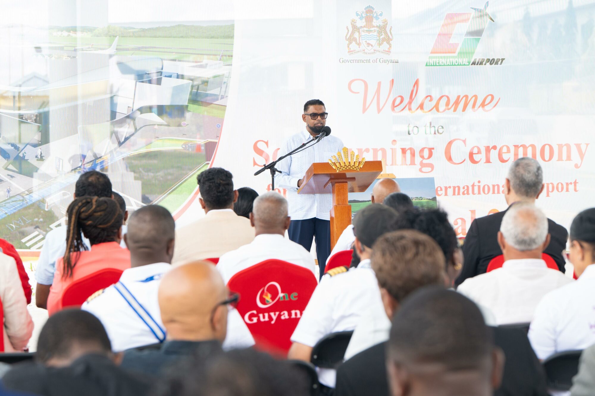 WhatsApp Image 2025-08-25 at 3.24.52 PM (2)August 25, 2025 President Dr Mohamed Irfaan Ali addressing the gathering during the sod turning ceremony to construct second terminal CJIA