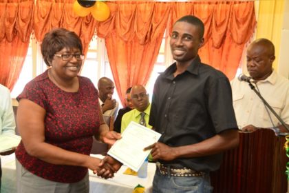 Ms. Patsy Russell, Facilitator of the Financial Literacy and Small Business Training Programme presents Mr. Mortimer Dey with his certificate.