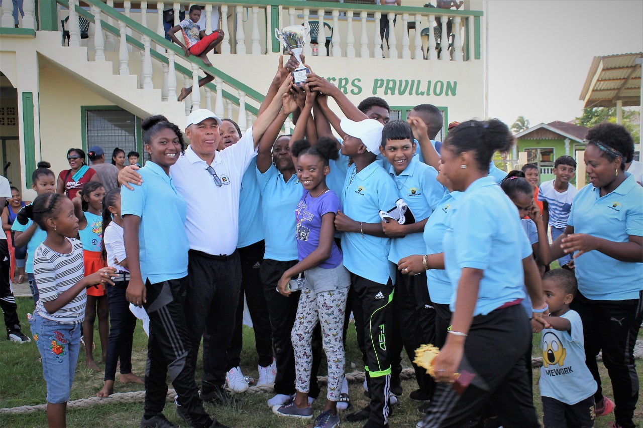 WhatsApp Image 2019-05-28 at 1.05.20 PMMay 28, 2019 Minister of Social Cohesion, with responsibility for Sport, Dr. George Norton celebrating with Visionary Youth Club after their victory against Houston Club